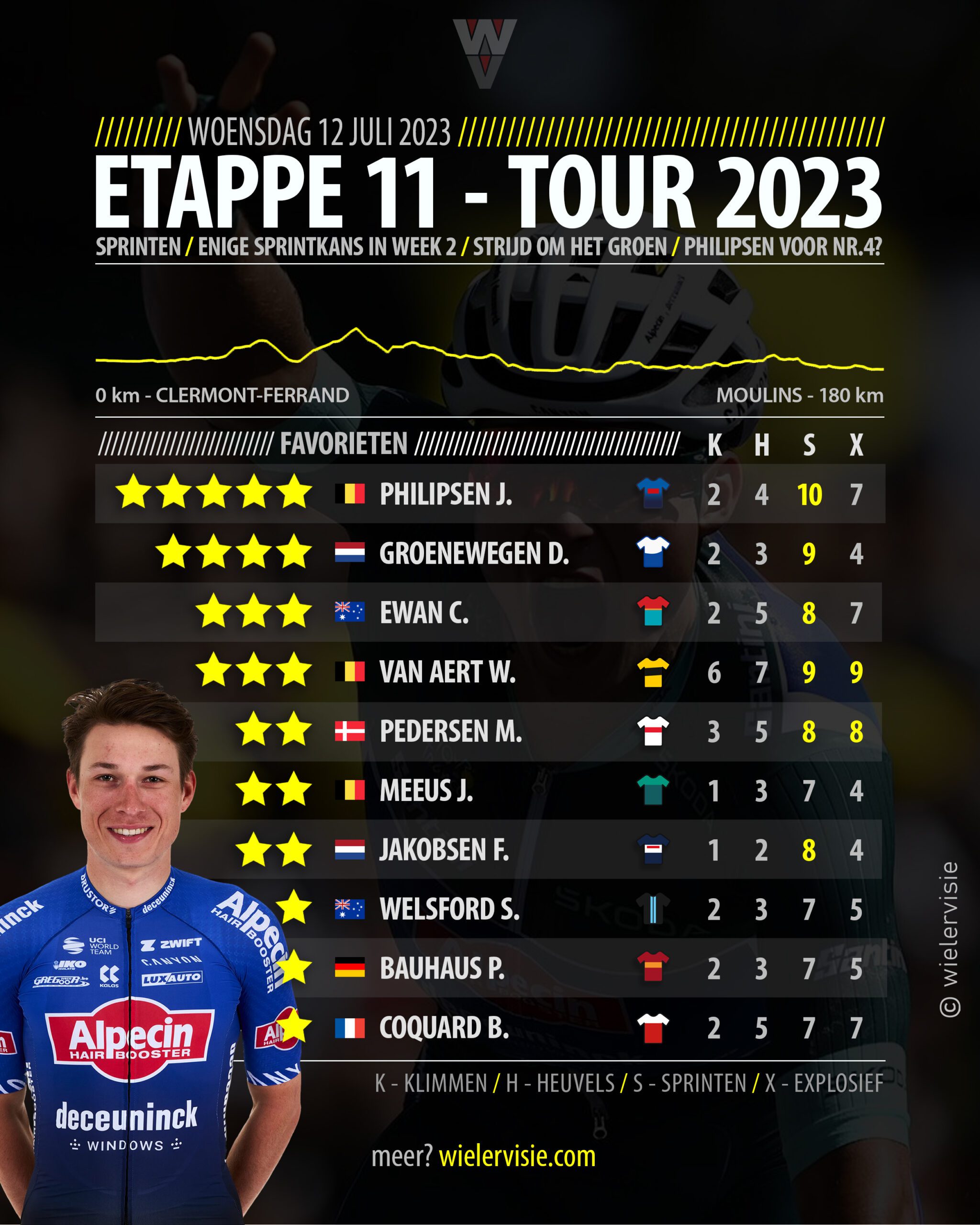 De elfde rit in deze Tour de France biedt de sprinters hun enige kans in deze tweede week. De etappe van Clermont-Ferrand naar Moulins gaat een aantal keren flink de hoogte in, maar is nergens lastig genoeg om de sprinters in verlegenheid te brengen.