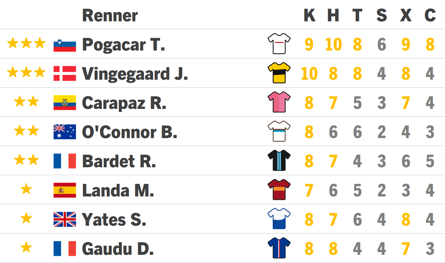 k-klimmen / h-heuvels / t-tijdrijden / s-sprinten / x-explosief / c-kasseien