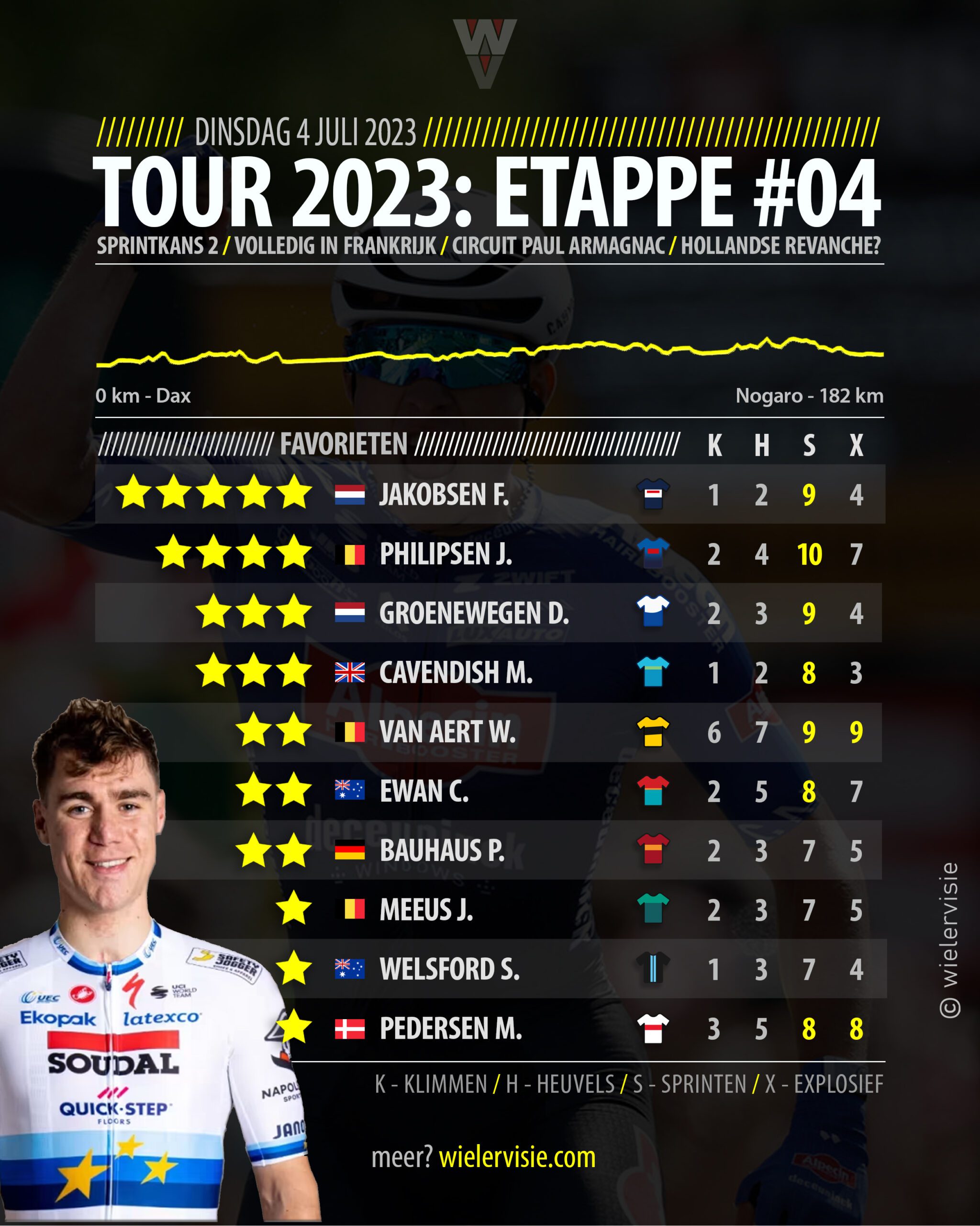 Waar rit 3 niet voor alle sprinters een zekerheidje is, is rit 4 dat wel. Deze overwegend vlakke etappe naar Nogaro is er écht een voor de sprinters. Het traject tussen Dax en Nogaro kent één gecategoriseerde helling op zo’n 27 kilometer van de finish.