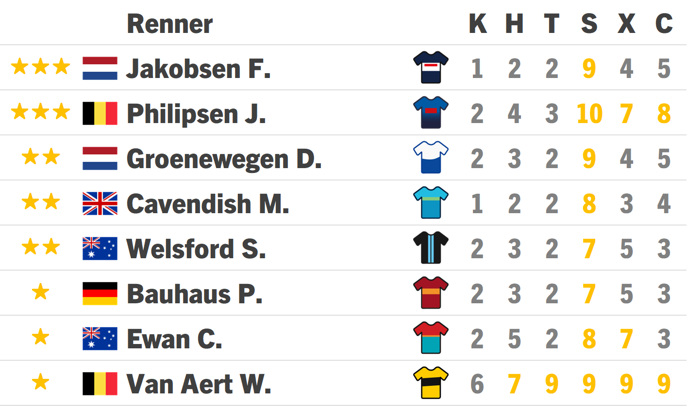 k-klimmen / h-heuvels / t-tijdrijden / s-sprinten / x-explosief / c-kasseien