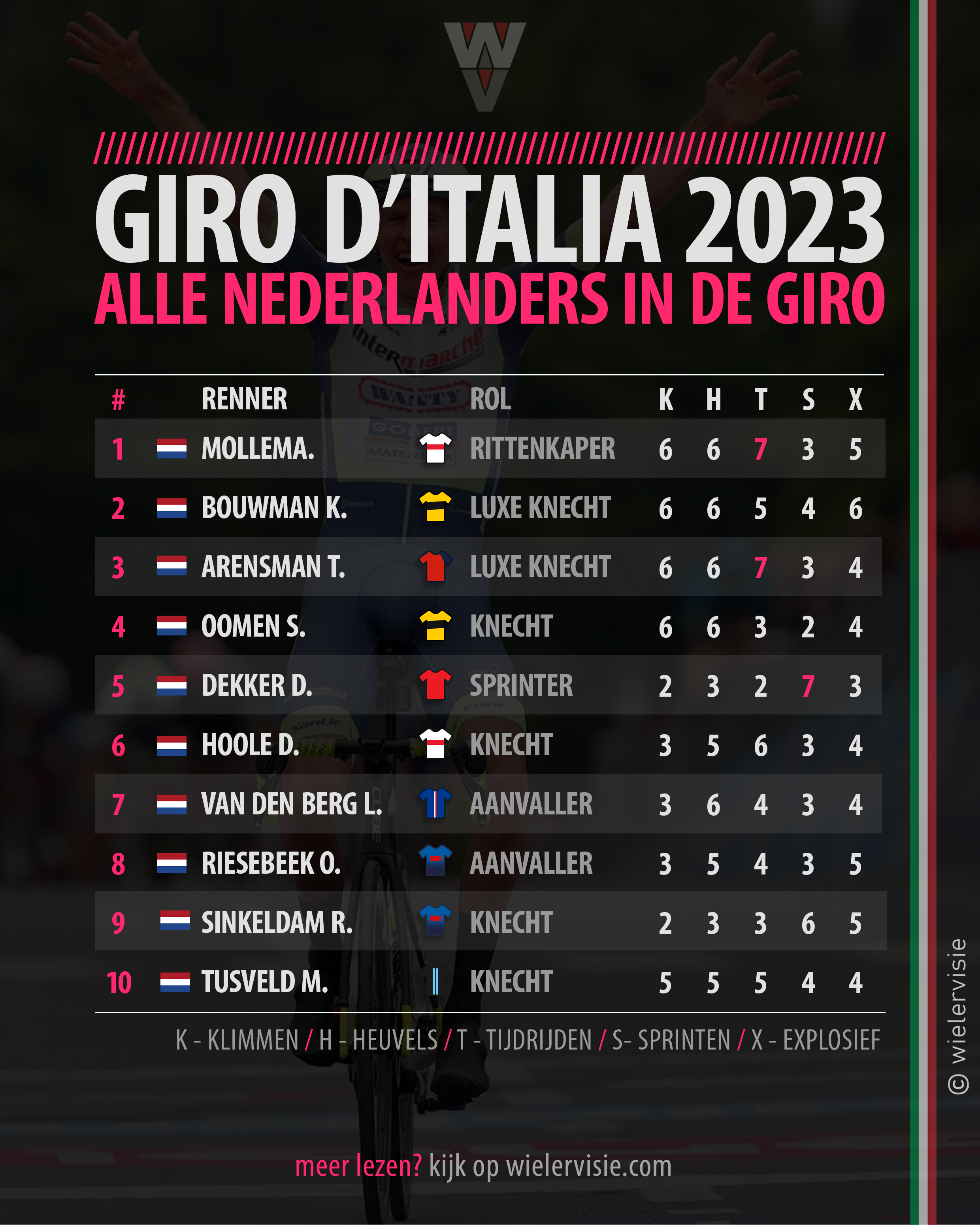 Namens Nederland is er dit jaar geen klassementsrenner aanwezig in de Giro. Toch is er in het hooggebergte genoeg te beleven vanuit Nederlands oogpunt. Denk maar eens aan aanvaller pur sang Bauke Mollema, of luxe knecht en